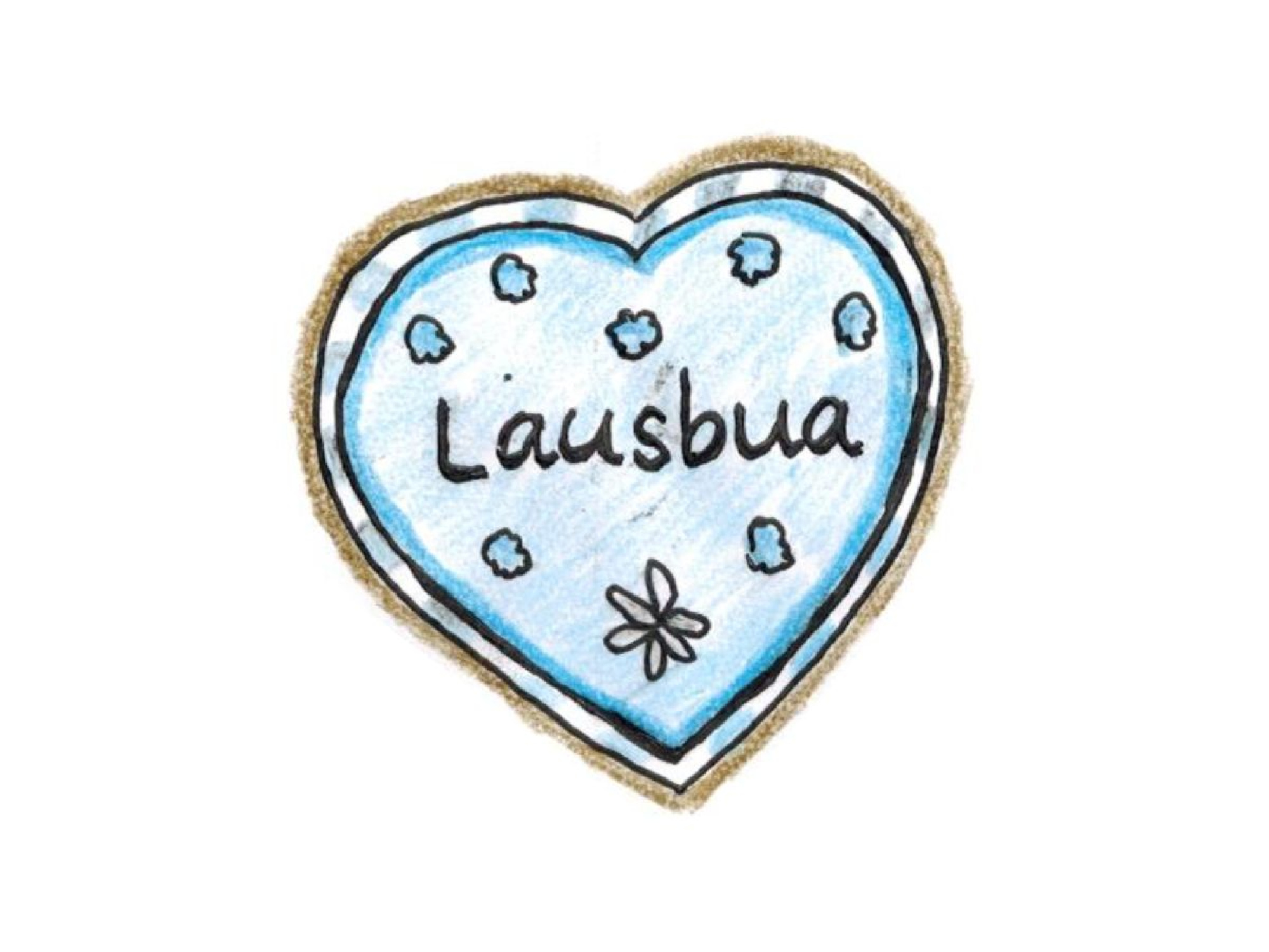 Ein gezeichnetes hellblaues Lebkuchenherz mit der Aufschrift: Lausbua